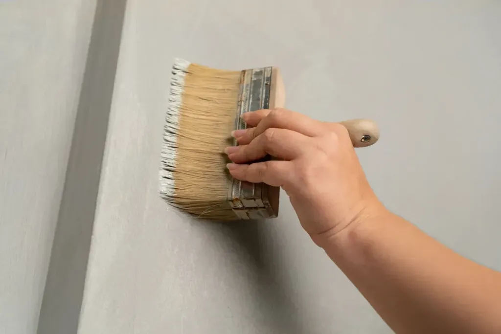 - Tragen Sie den ersten Anstrich der Kalkfarbe mit einem feinen Borstenpinsel auf.