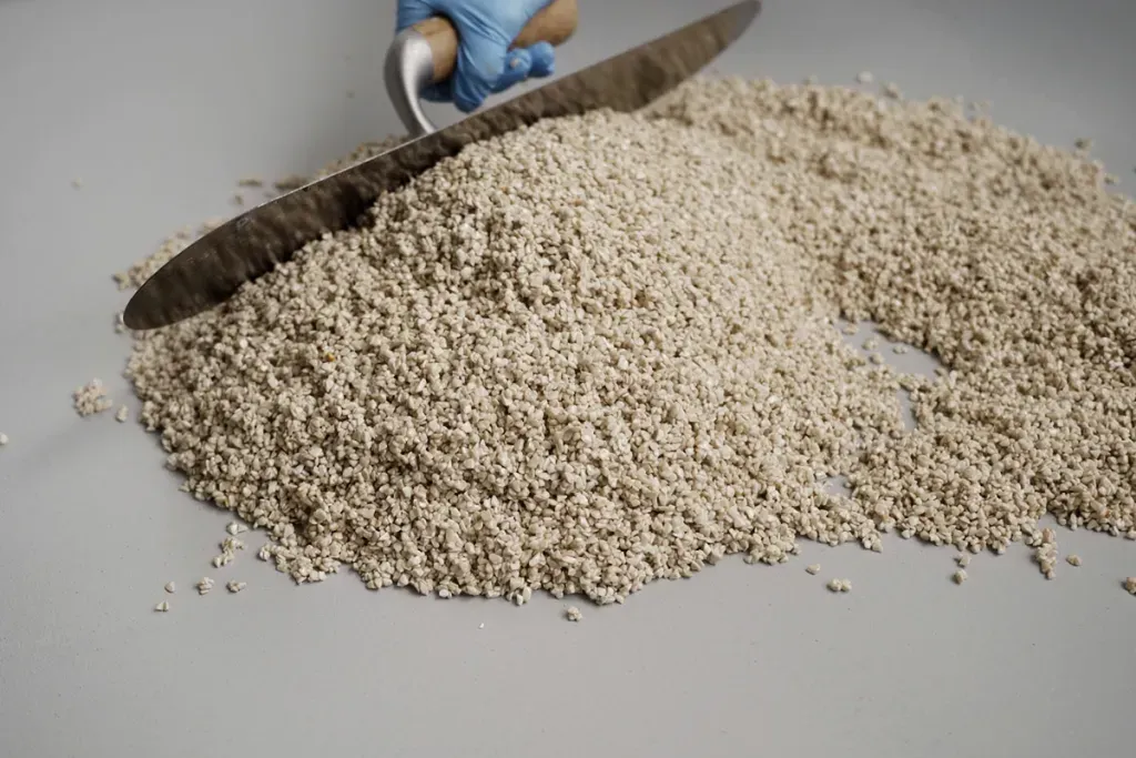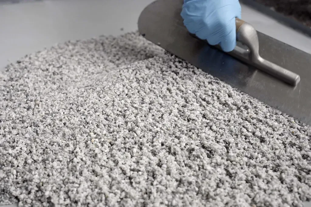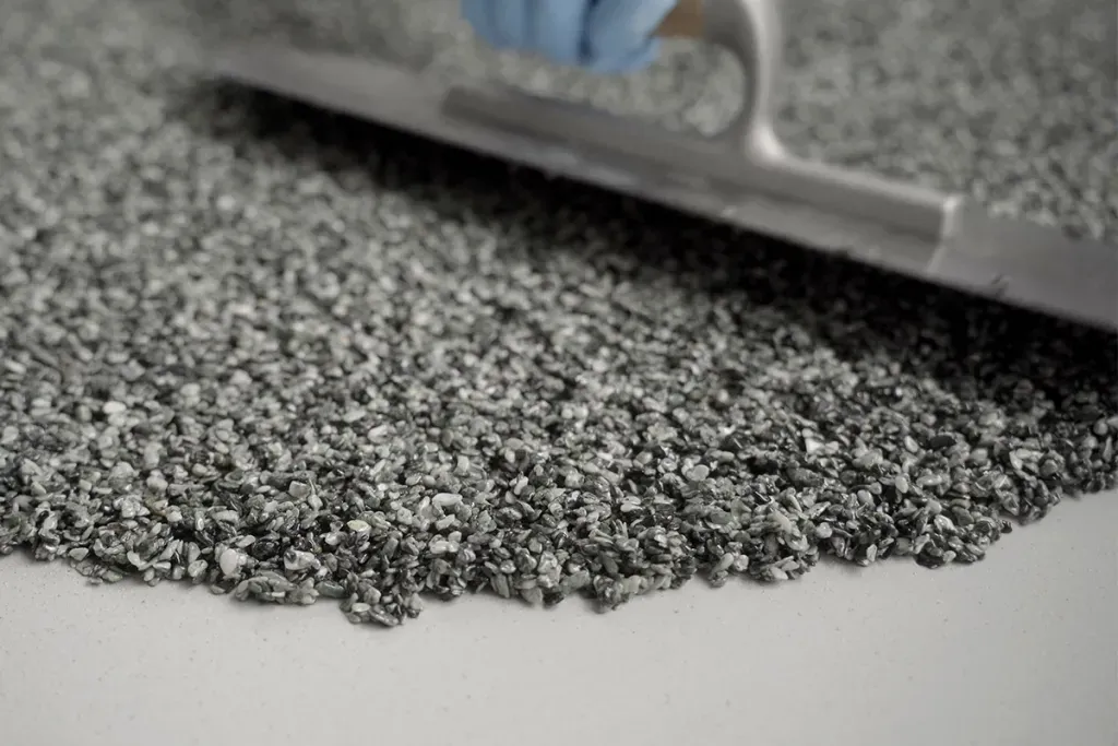 - Ideal for distributing the stone granulate when laying the stone carpet on rounded surfaces such as pools, columns and arches